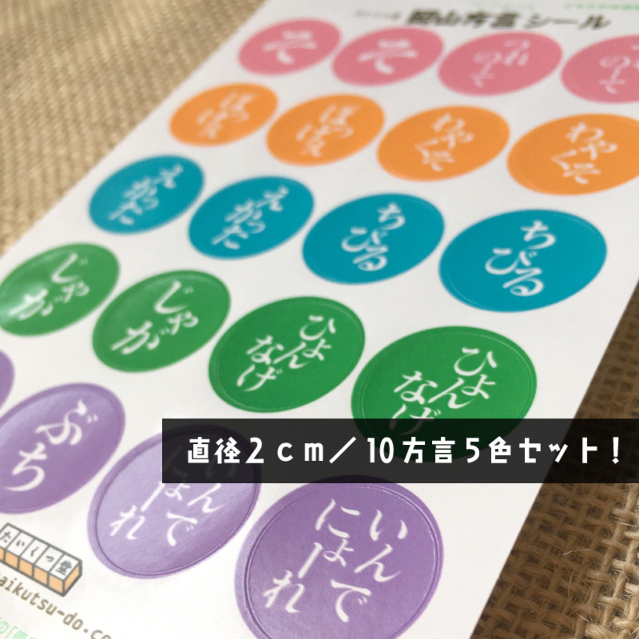 人気の10方言を2枚ずつ5色展開、20枚の丸シールシートです。